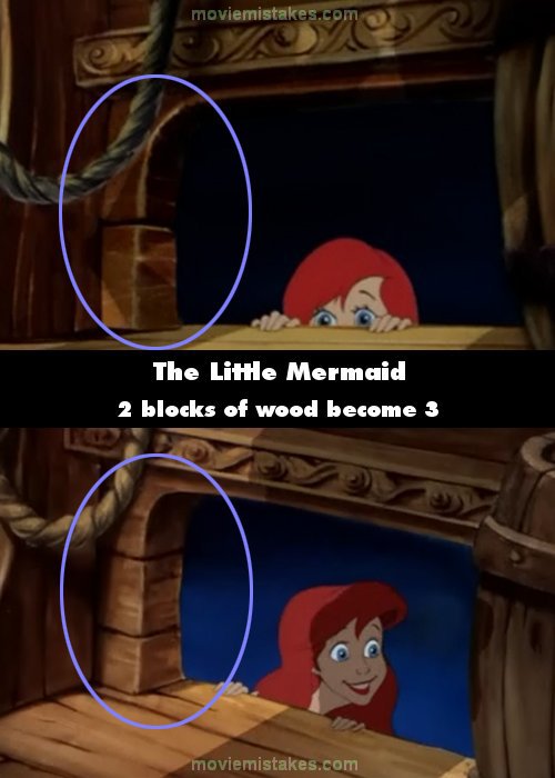 Continuity mistake: When Ariel spies the guys on the boat, she is under an arched window. Depending on the angle, the space is made of 3 blocks of wood, or 2. This keeps changing randomly all the time.