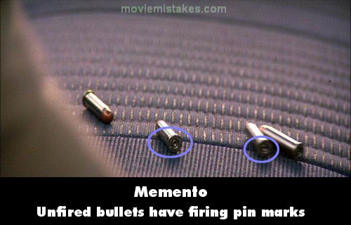 Revealing mistake: At the 'beginning' when Teddy and Leonard drive up to the abandoned building with the old truck out front, inside the truck Leonard handles a number of .357 revolver calibre bullets that have apparently not been fired, but you can clearly see the indented primers in the base of the bullets, indicating that they are just inert movie props. (00:04:40)