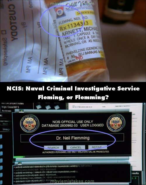Continuity mistake: The pill bottle the agents recovered from the house has the Doctor's name "Fleming" to search for. But when McGee searches the NCIS system, he spells the name "Flemming" and gets his results. As well, the scrip sheets for Dr. Flemming archived on the computer, contain several identification numbers - DEA (AJ0000000000), Batch (00000001) & License (C00000.) - not real numbers - so the prop master didn't even try to fake any of them. (00:15:20)