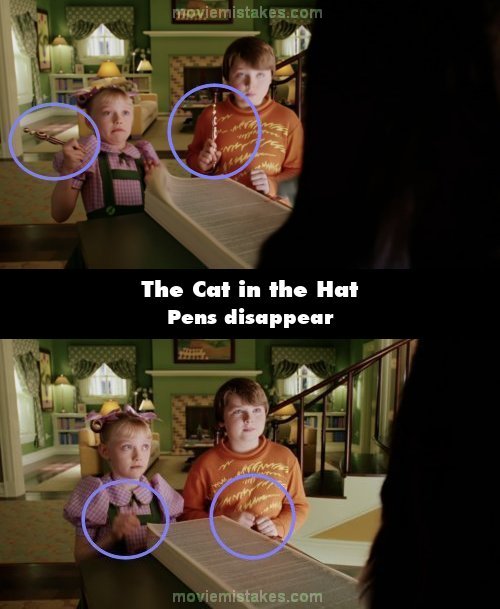 Continuity mistake: In the scene where Conrad and Sally are signing the contract, they have the pens in their hands, but when Cat says, "Give me five!" the pens have disappeared.