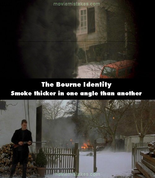 Continuity mistake: When Bourne blows up the tank at the farmhouse, the wide shots show a solid wall of black smoke. In the closer shots there's nowhere near as much. The smoke in the first shot must be coming from the explosion, and in the closer shot we're looking right at the destroyed tank, so it can't be due to different angles. (01:26:27)