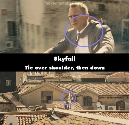 Continuity mistake: As Bond chases Patrice over the rooftops of the Grand Bazaar in Istanbul at the start of the film, in the close ups of Daniel Craig his tie can be seen noticeably flapping over his shoulder (as you would expect). But in the long shots with the stuntman it doesn't move about at all, presumably having been fixed in place for safety. (00:04:40)