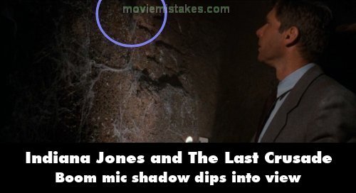 Visible crew/equipment: In the catacombs after Indy passes the picture of the Ark Of The Covenant and approaches the next wall with the lighter, (when the screen goes upwards a bit) the shadow of a boom mic can be seen dropping into view at the top of the lighted wall. (00:31:40)
