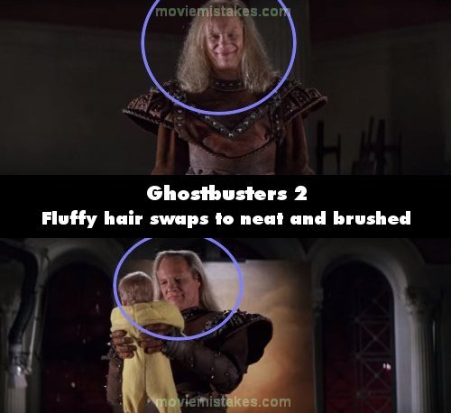 Continuity mistake: In the museum, when Dana is trapped and the Ghostbusters lay on the floor, right before Vigo grabs the baby, Vigo's hair is fluffy and messed up. A shot later it's straight and neatly brushed. (01:34:40)