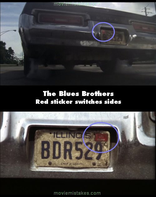 Continuity mistake: The sticker on the license plate is in the beginning on the left side (before the Bluesmobile jumps over the bridge), then on the right side (after the Nazis jump from the bridge). (00:08:35 - 00:52:40)