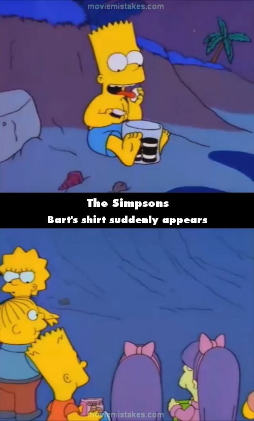 Continuity mistake: When Bart comes out of the water with the cooler, he doesn't have a shirt on. At no point does he put his shirt back on, it reappears when Lisa takes the food off everyone. (00:12:45)