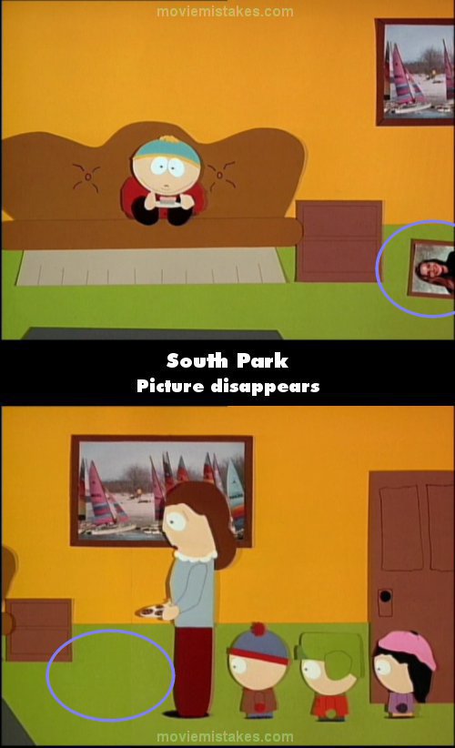 Continuity mistake: When Cartman accidentally sets Fluffy the Cat on fire, it jumps up into the air and knocks over a picture and it falls onto the floor. When Stan, Kyle, Cartman's mom and Wendy walk into the living room in the next shot, the picture has disappeared. (00:17:45)
