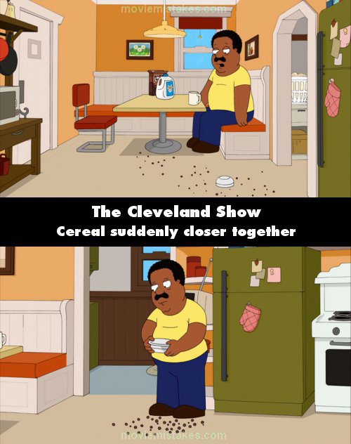 Continuity mistake: When Cleveland Junior tosses the cereal on the floor, the position of the cereal changes when Cleveland goes to put it under the fridge. (00:11:45)