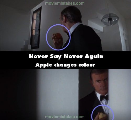 Continuity mistake: Right before Bond grabs a bike and chases Fatima Blush, he is eating an apple which swaps from yellowish-red to fully yellow, between shots.