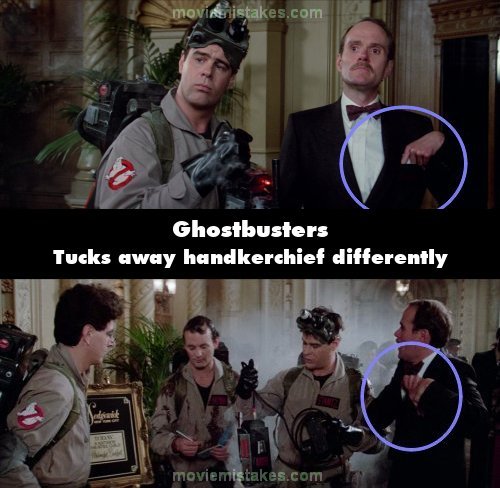 Continuity mistake: When the hotel manager refuses to pay the bill after the Ghostbusters capture the green ghost (Slimer), you can see he is putting his handkerchief into his top pocket with his left hand, but in the very next shot he can be seen putting the handkerchief in the pocket with both hands. (00:38:50)