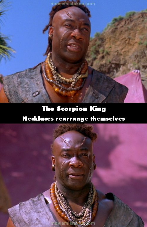 Other mistake: In the scene where Mathayus happens upon the hide out of Balthazar and his people and are confronting one another, Balthazar's necklaces change from being messily arranged to neatly graduated in frame to frame. Surely he wouldn't have been rearranging the necklaces while confronting the Arcadian? (00:53:20)