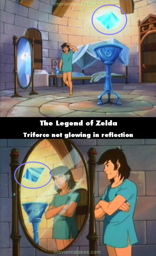 Continuity mistake: Link gets out of bed and is complaining about his new life in the castle. The Triforce of Wisdom is levitating on a pedestal. It is sparkling and glowing brightly. Link then steps in front of a mirror and the Triforce is seen in the mirror. The reflection shows no sparkles or any glowing. (00:01:30)