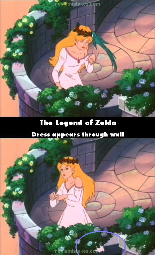 Revealing mistake: When Link calls down to Zelda from the tower, you can see a fault in the drawing as Zelda moves. There is a low wall around her on the balcony, with flowers and vines on it. As she moves, you can see some of her dress pass right through the wall and vines towards the lower right. (00:01:50)