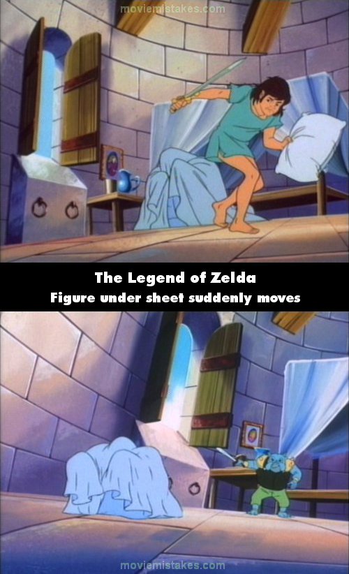 Continuity mistake: Shortly after Link fights the Moblin with the staff, and the vase and painting of Zelda are broken, it shows the Moblin he threw at his bed earlier still under the sheet and struggling to get out. The Moblin is suddenly much further from Link's bed than before and is where Link was fighting the staff Moblin moments before. (00:03:10)