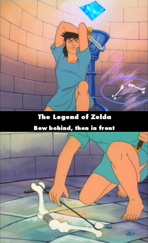 Continuity mistake: Link begins shooting sword lasers at the Moblins to finish them of. The last one comes up behind Link as he is kneeling down. Without turning around, Link lifts the sword over his head and fires the laser behind him. The Moblin vanishes and drops a Magic Bow. Then, Without getting up or turning around, Link reaches down in front of him to pick up the bow. (00:03:40)