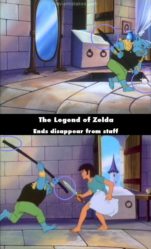 Continuity mistake: One of the Moblins has a black spear, having a sharp black blade on one end, and a white skull at the other. But when he charges Link and fights him head on, suddenly the spear head is gone, as is the skull, making it just a black staff. (00:02:45)
