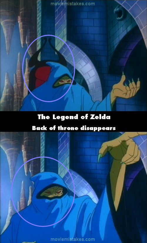 Continuity mistake: While Ganon is disguising himself as an amateur magician, he makes a throne to sit in. The back of the throne is red and black and has horns, very noticeable. As Ganon begins conjuring skeletons to hold up the throne, his back is flush with the back of the chair. However, in one close up shot, the back of the throne is gone. (00:06:35)