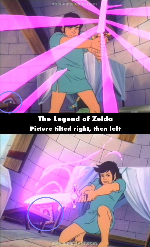 Continuity mistake: As Link charges up his sword laser, the picture of Zelda is shown behind him leaning to the right. Then the next shot as he is turning around to shoot the Moblins, the picture is now leaning to the left. Also the table's legs are suddenly broken between shots. (00:03:25)