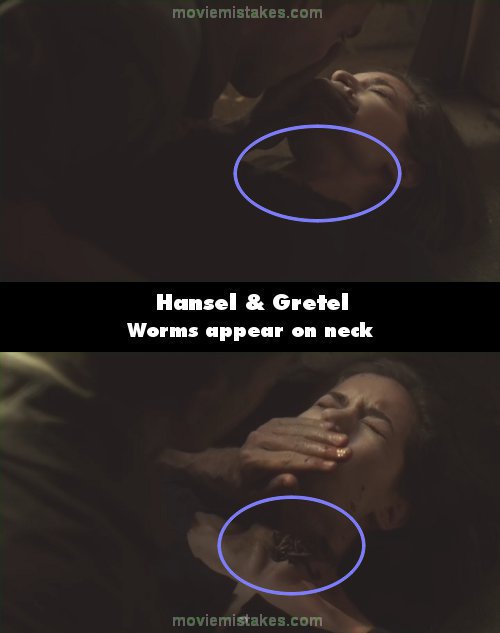 Continuity mistake: When Hansel and Gretel are hiding from John, a jar of worms has been broken on the table they are under. Some worms fall through and land on Gretel's face, leaving dirt. The shot cuts to John, then right back to Gretel and suddenly her face has no dirt. Throughout that entire sequence, dirt and worms keep appearing and disappearing from her face and neck. (00:48:30)