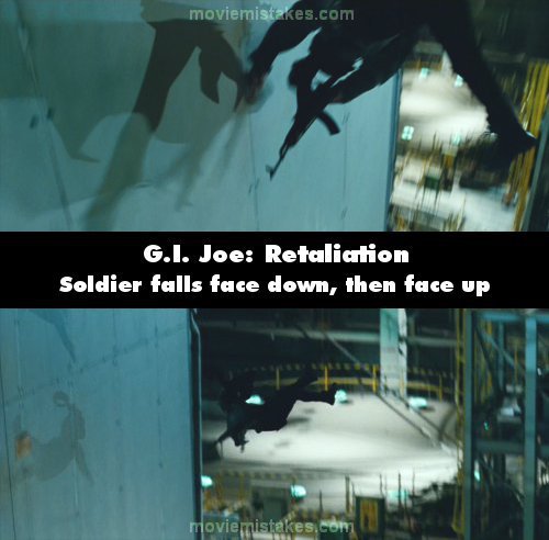 Continuity mistake: While after the first nuke, Flint pushes an enemy solder over a railing to plummet to his death. He falls face down, but in the next shot, he is falling face up. (00:11:15)