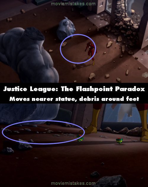 Continuity mistake: When Flash zooms into the Flash Museum, he circles around a statue of himself and stops back in front of it. The statue's decapitated head is shown approximately 6 to 9 feet away from him, and there is only a little bit of debris around his feet. The shot cuts to some explosive tops landing at his feet and suddenly he is much closer to the statue's head, being now about 2 or 3 feet away from it, and there is much more debris around his feet. (00:03:25)