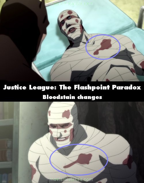 Continuity mistake: After Barry wakes up in bandages with third degree burns all over him, there is a spot of blood on his chest below his left shoulder. A good amount of the blood stain overlaps a line dividing two strands of the bandage. Moments later when he sits up, the blood is barely above that line at all. Later when Barry is sitting in the chair again, that same stain has completely changed shape. Other patches of blood on him also change. (00:36:20 - 00:38:00)