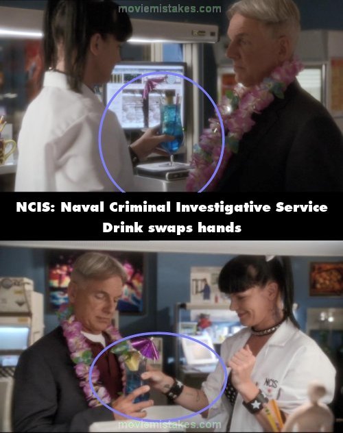 Continuity mistake: When Gibbs comes into Abbie's lab, she hands him a blue Fufu drink, it starts in her left hand, at the cut it jumps to her right hand. (00:07:50)