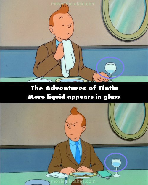 Continuity mistake: At the Syldavian Restaurant, Tintin drinks a glass of wine until there is 10% left. The level of wine raises 50% later. (00:06:50)