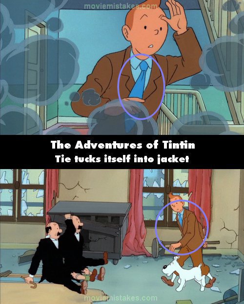 Continuity mistake: When the room explodes, Tintin's tie is placed in front of his blazer. A few seconds later, the tie is suddenly placed behind the blazer. (00:09:55)