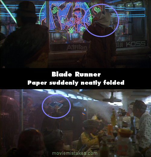 Continuity mistake: While waiting in the rain for his food, the chef across the street calls Deckard to come over. Deckard folds his newspaper and puts it over his head to shield himself from the rain. The paper is folded messily and the crease side is in his hand. When he gets to the other side of the street, the fold is suddenly much cleaner and neat, and the crease side is on the outside, no longer in his hand. (00:09:00)