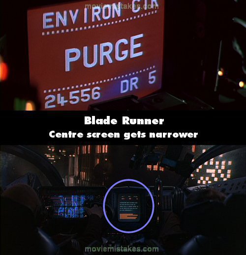 Continuity mistake: After Gaf takes Deckard to his police car to go see Captain Bryant, he looks at a screen that is blue, then turns red and says PURGE. He looks down and to his right when he sees this. Moments later as they are flying in the vehicle, a view from the back seat shows the front dash with two screens. The one in the center, which would have been the one he was looking at since he was looking down to the right, is now much skinnier than it was moments before. It's the one showing green and orange text now. (00:10:25 - 00:11:10)