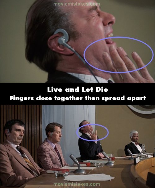 Continuity mistake: When the first British MI6 agent (Dawes) is killed by killer waves sent through his earphones at the United Nations, he has his fingers closed when the waves go through, but the next shot shows him with his fingers wide apart. (00:01:50)