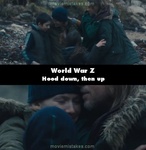Continuity mistake: When Gerry reunites with his family in the Nova Scotia Safe Zone, the boy gets into the family hug, with his sweatshirt hood down. The camera angle changes and it is up. (01:55:35)