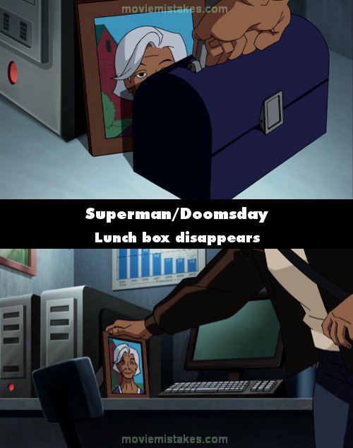 Continuity mistake: After Perry White tells Clark to write articles when he's out of the country, Clark reaches over to his desk and picks up a purple lunch box with his right hand. His left hand has his bag in it. He then sees the picture of his mother, Martha, and reaches out with his right hand to pick it up and look at it. The lunch box is gone. He sets the photo back down and turns off his computer, and you see his left hand still holding nothing but his bag, and he turns to walk away. After he gets off the elevator, he suddenly has the lunch box again. (00:04:25)