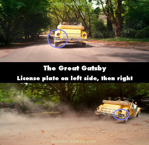 Continuity mistake: Just after Gatsby asks Nick his opinion of him, there is a cut to a low angle of him driving. In the shot from behind the car, the number plate is on the right hand side of the back of the car. This is only visible for a fraction of a second, so you have to be quick when you look at this. 2 shots later, the number plate has moved to the left side of the back of the car. (00:36:10)