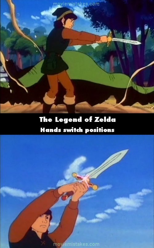 Continuity mistake: After the dragon slips on Zelda's banana peel, Link leaps off it and turns to fire a sword laser at him. Before the cut, Link's hands are on the handle where his right hand is over his left hand. Then it cuts to a different angle and his hands switch positions suddenly. (00:04:30)