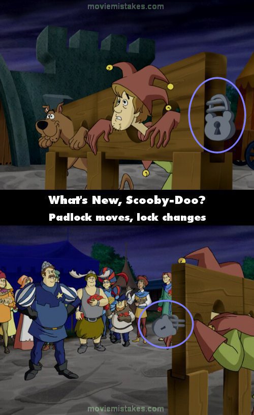 Continuity mistake: As Scooby and Shaggy are locked up for stealing the frozen bananas, the lock is placed on their holder hanging down straight. A couple shots later, it is now hanging out to the side and is smaller, most noticeably the lock hole is smaller. The lock hole also changes what side it is on. (00:06:40)