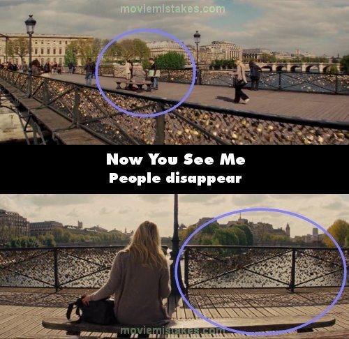 Continuity mistake: When Alma walks over to the bench on the bridge, there is a woman sitting on it and a guy standing next to the bench. When she sits down, the woman sitting and the guy standing next to it have instantly vanished. (01:51:20)