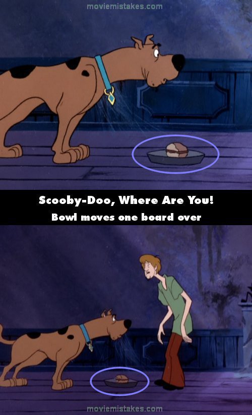 Continuity mistake: Scooby finds a half eaten hamburger in a plate on the floor. When the camera cuts further back to show Shaggy, the plate has moved on the floor, as noted by the lines between boards and the placement of the plate and the spider web on the wall. (00:07:20)