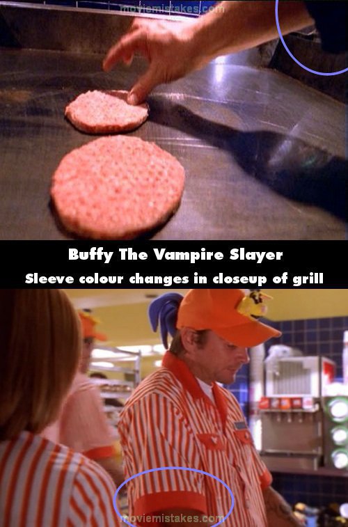 Continuity mistake: When Buffy is assigned to the grill, as Timothy explains the process he's wearing a short-sleeved orange/white stripe uniform. In the close-up, when he places the second patty on the grill, Timothy is wearing a 3/4 sleeve, dark blue shirt. (00:17:15)