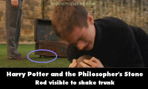 Visible crew/equipment: When Oliver Wood is explaining Quidditch to Harry, he struggles to put the Bludger back in the trunk. You can see a rod under the trunk lift and shake it, so the Bludgers appear to be moving on their own. (01:05:55)