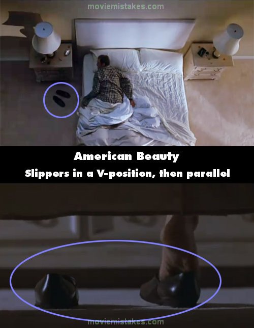 Continuity mistake: In the first overhead shot of Lester in bed, just before his shower, his slippers are positioned in a V-shape, but in the next shot, from under the bed, has them parallel to the bed. (00:01:34)