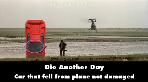 Revealing mistake: After the helicopter escape at the end, a red sports car is sticking nose-down in the ground after falling hundreds of feet down out of the aeroplane, without a single crack in the windscreen, in mint condition. The yellow one only has the right door open. (01:59:30)