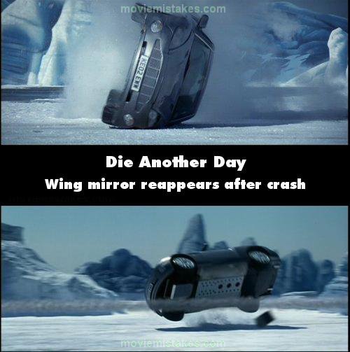 Continuity mistake: During the car chase on the ice, Bond's Aston Martin flips over. You can see the left wing mirror break off as this happens, together with a chunk of something else. When the car flips back over, the wing mirror's back on in one piece. A chunk of something else falls off though, but there's no visible damage to the car afterwards. (01:35:10)