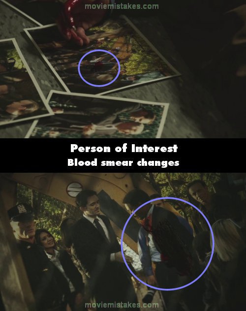 Continuity mistake: The blood smear on the photograph pointing out the head of HR changes position between shots.
