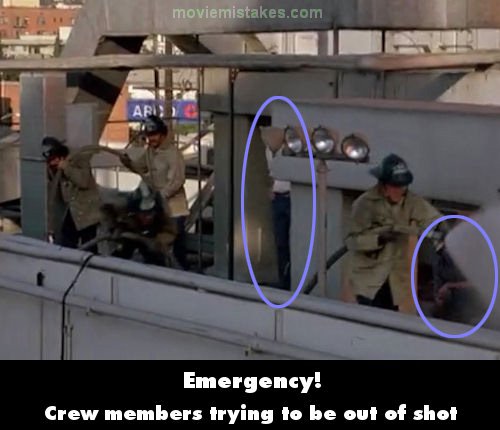 Visible crew/equipment: At the chemical plant fire, when Gage is covered in the flammable pentane, Chet hoses him down. When Marco says "John, you better stay here, " Chet and Marco head off. In the next shot, when the camera pans quickly to the left of the blaze, one crew member wearing jeans and a white shirt stands behind the firemen, and another crew member wearing a grey shirt crouches at the side.