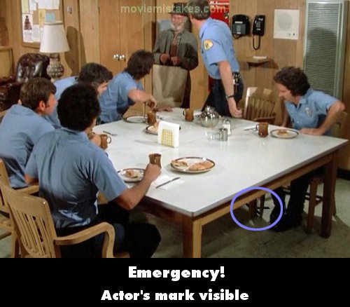 Visible crew/equipment: When Mr. Laurents visits Station 51, as the guys stand up the actor's T-mark is visible on the floor, between DeSoto and Chet, just before Chet promptly stands at his mark.