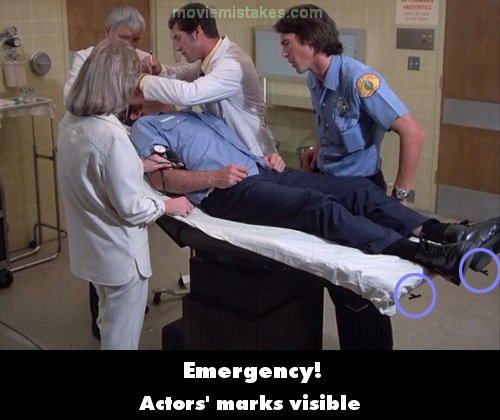 Visible crew/equipment: When Roy is in the ER due to the dizziness, two actors' T-marks are visible on the floor near the door, where moments later Dr. Bracket and Dr. Early stand before leaving. Additionally, Dr. Early's mark (during The Exam) becomes visible when Dixie shifts her position, just as Dr. Bracket asks, "Any pain here, Roy?"