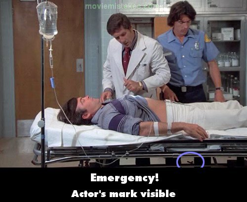 Visible crew/equipment: When Mr. Grady (self-defense instructor) is in the ER, being examined by Dr. Brackett, there is a visible T-mark on the floor behind Gage.