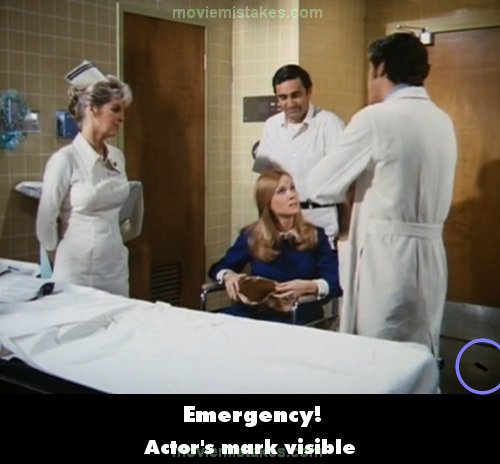 Visible crew/equipment: When Dr. Bracket and Dixie begin to explain to Jenny that she was only hyperventilating, as she sits down in the wheelchair, the actor's tape mark is visible on the floor by the door, just before Dr. Bracket walks over and stands on it.